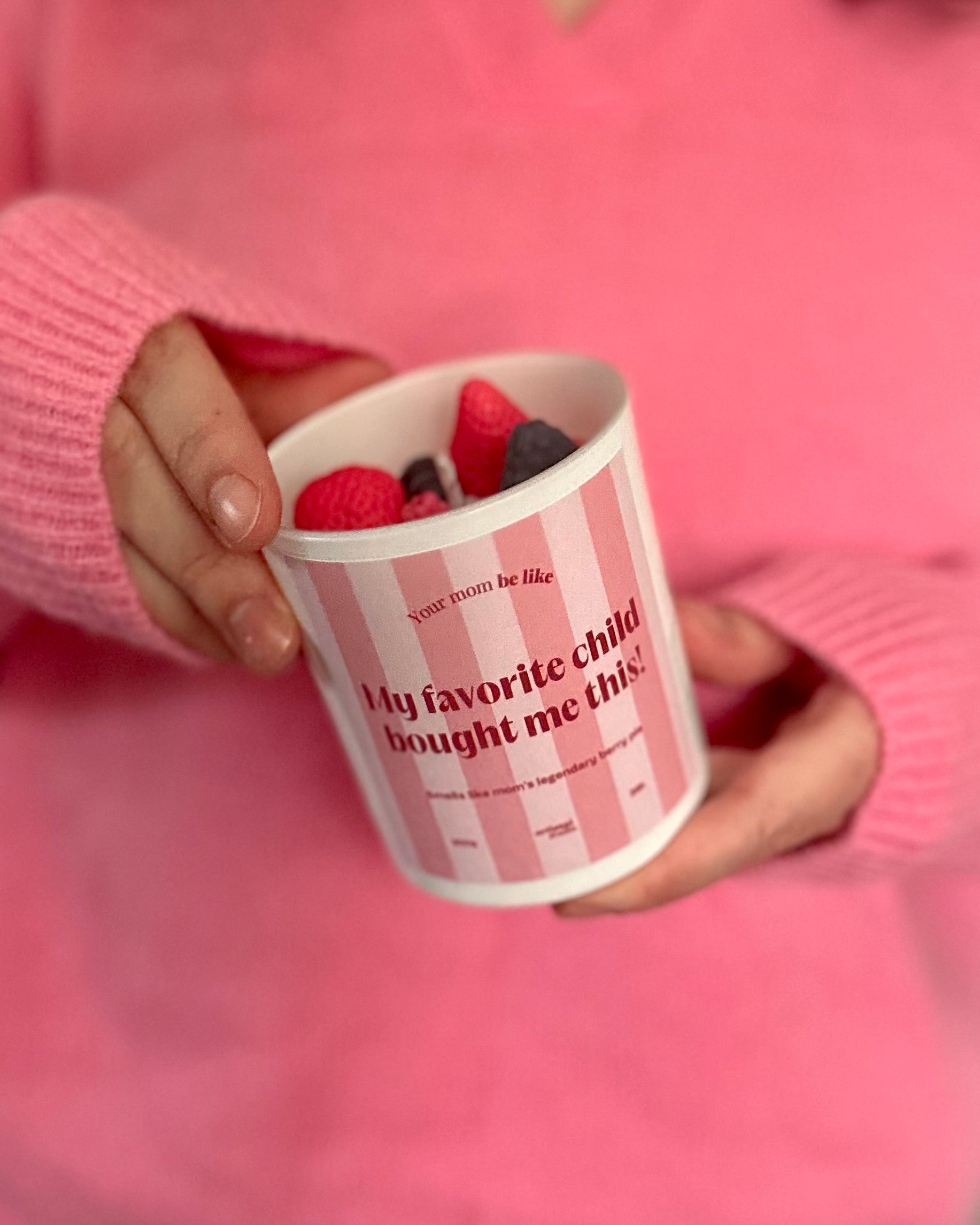 Decorada com frutos vermelhos — como uma sobremesa bonita pronta a ser servida — e com a etiqueta atrevida “My favorite child bought me this”, junta o lado sentimental ao toque de picardia perfeito.